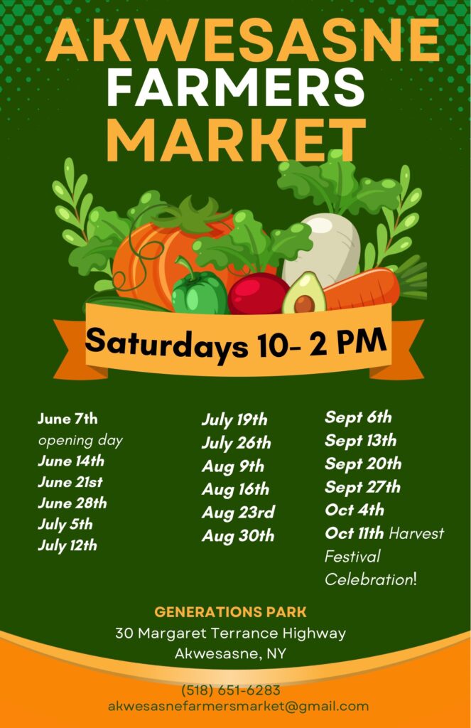 Visit the Akwesasne Farmers Market at Generations Park every Saturday throughout the summer for locally grown foods, fresh produce, food, drinks, and artisans! Get to know your local food producers and makers.