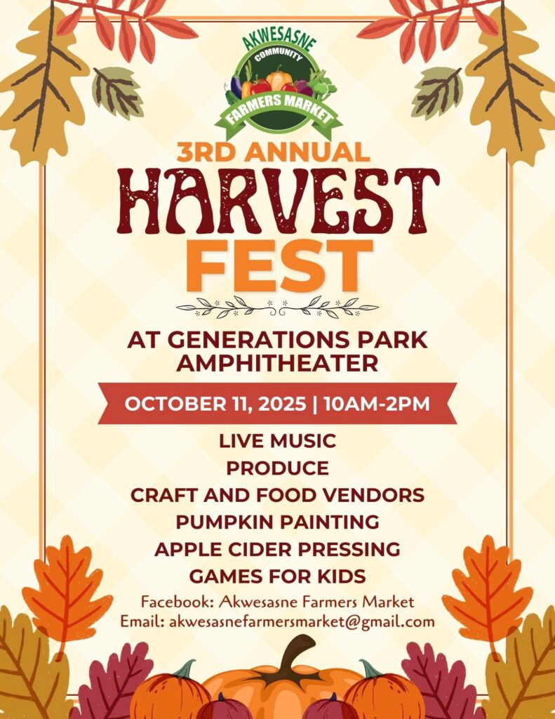 Celebrate fall Harvest Fest, presented by Akwesasne Farmers Market! Join the fun at Generations Park in Akwesasne. Enjoy games, treats, live music, cider pressing, and vendors!